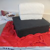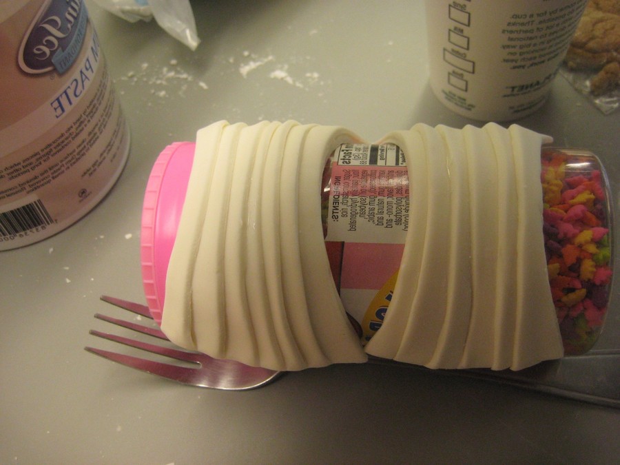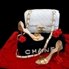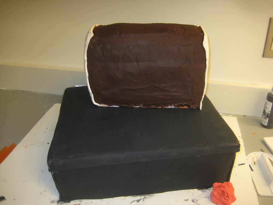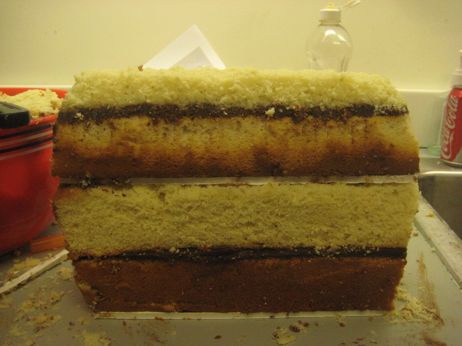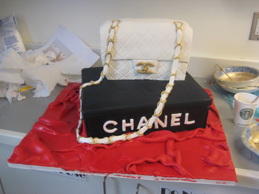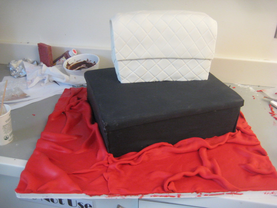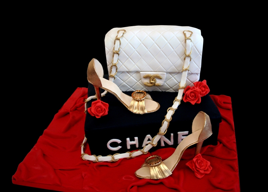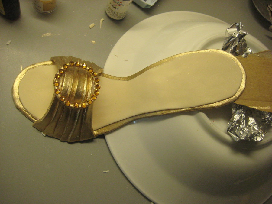 White almond sour cream cake with chocolate ganache filling. Shoes made out of fondant with tylose added. Everything is edible except for the rhinestones on the shoes!