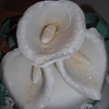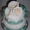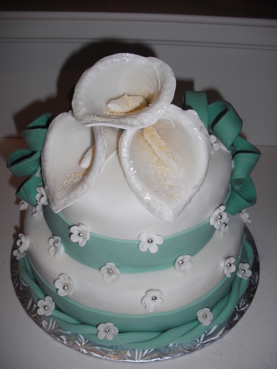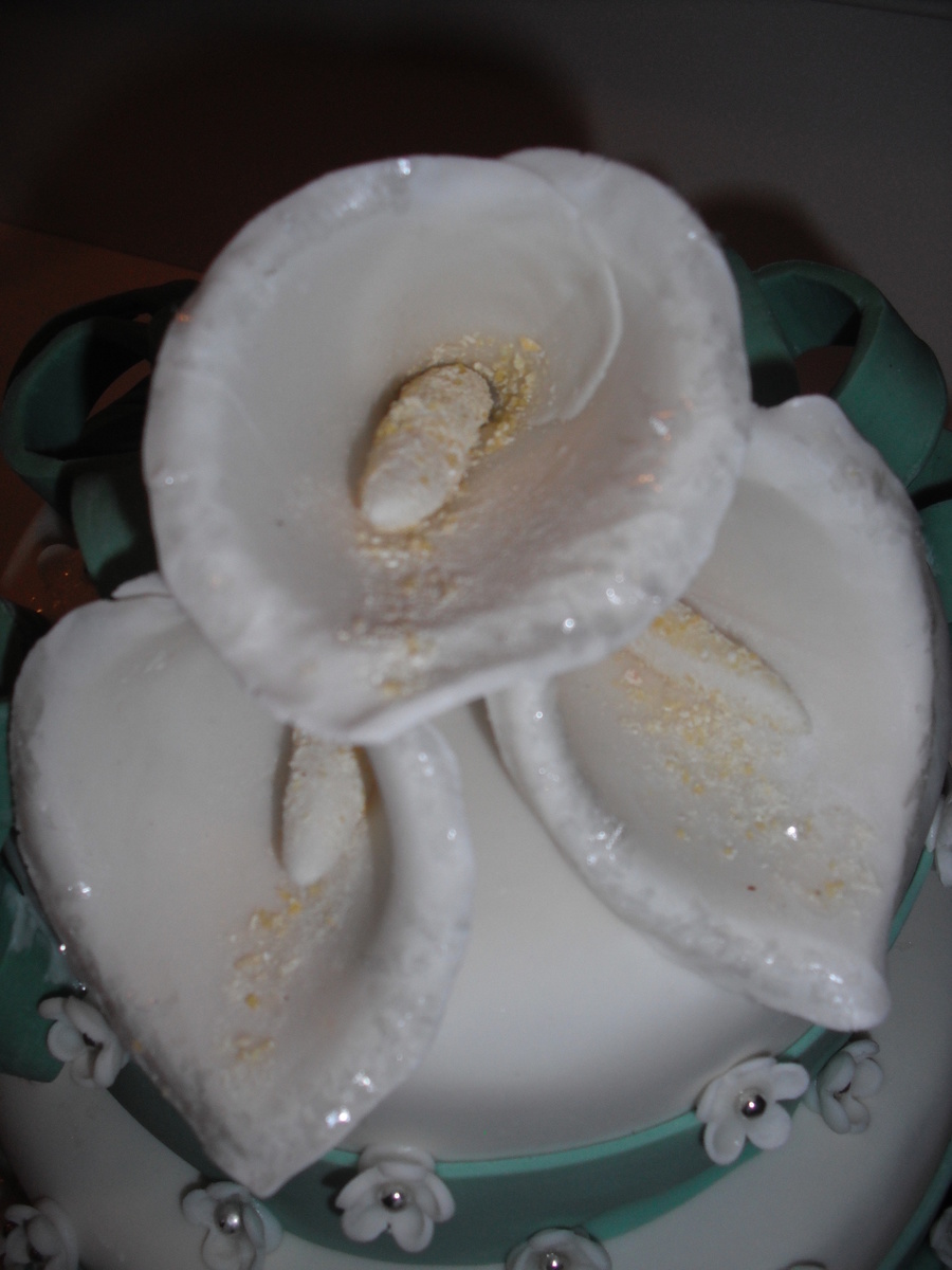 cake decorating class, it was my first time covering a cake in fondant. I made calla lilies out of gumpaste. The cake was carrot cake with cream cheese frosting.