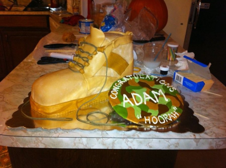 Basic Training graduation cake made for my brother. Carrot cake with Cream Cheese Icing, covered in fondant.