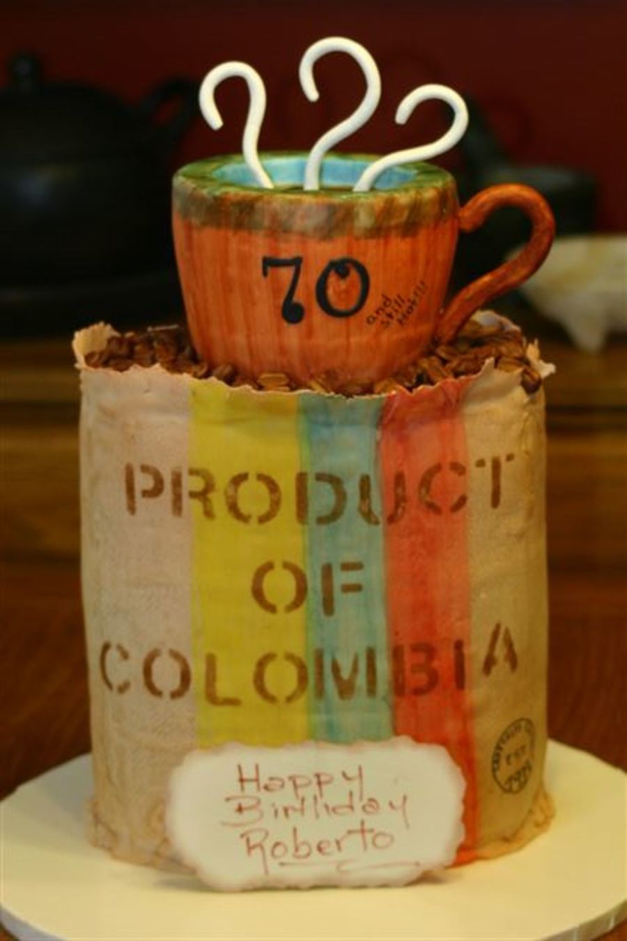 I made this cake for my dad 70th birthday. Is a 4 tier cake sculpted to look like a coffee bag. The mug is also cake and the coffee beans are made out of gumpaste. Thanks for looking.