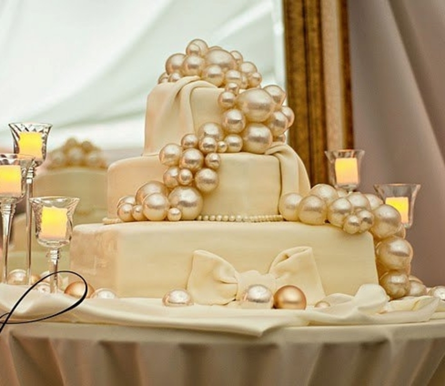 Bubbles are made of gelatine with pearl shimmer. Everything else is fondant. Bottom tier is square, middle is a heart, and top is circle.
