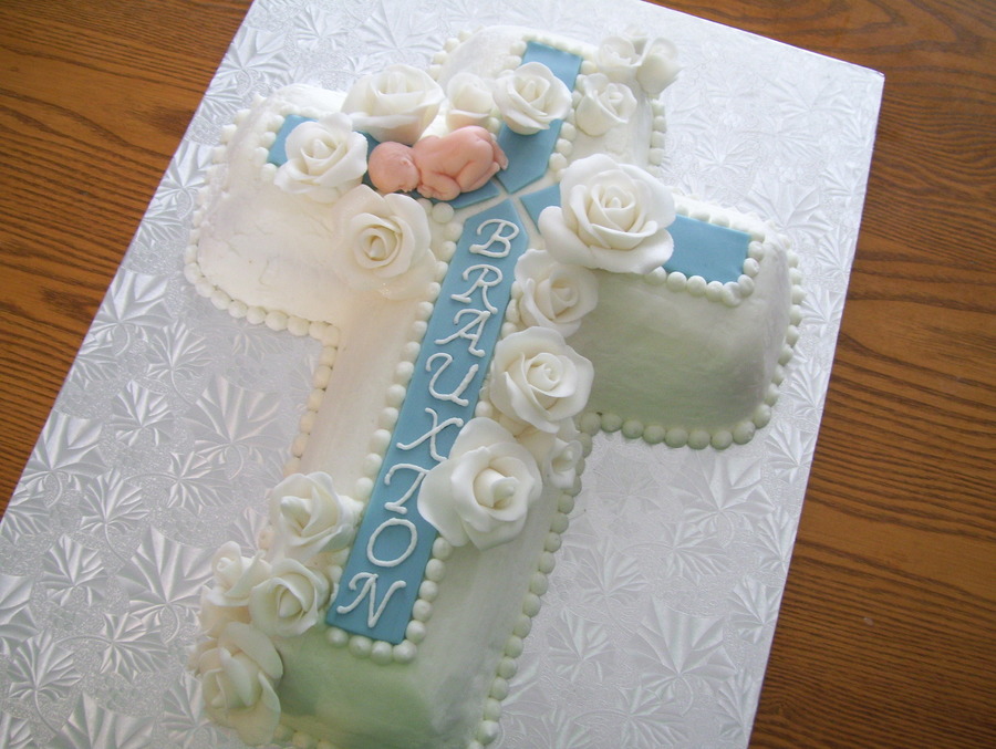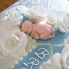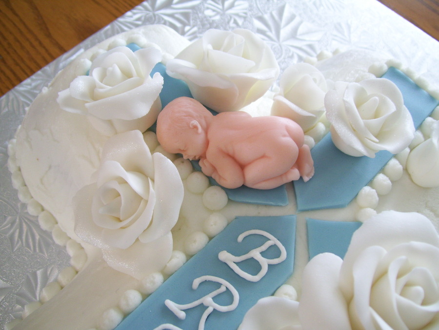 One of the final cakes for my only grandchild's baptism. Buttercream icing and fondant roses. The baby is also made of fondant.