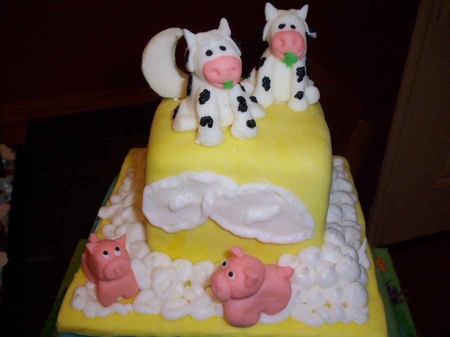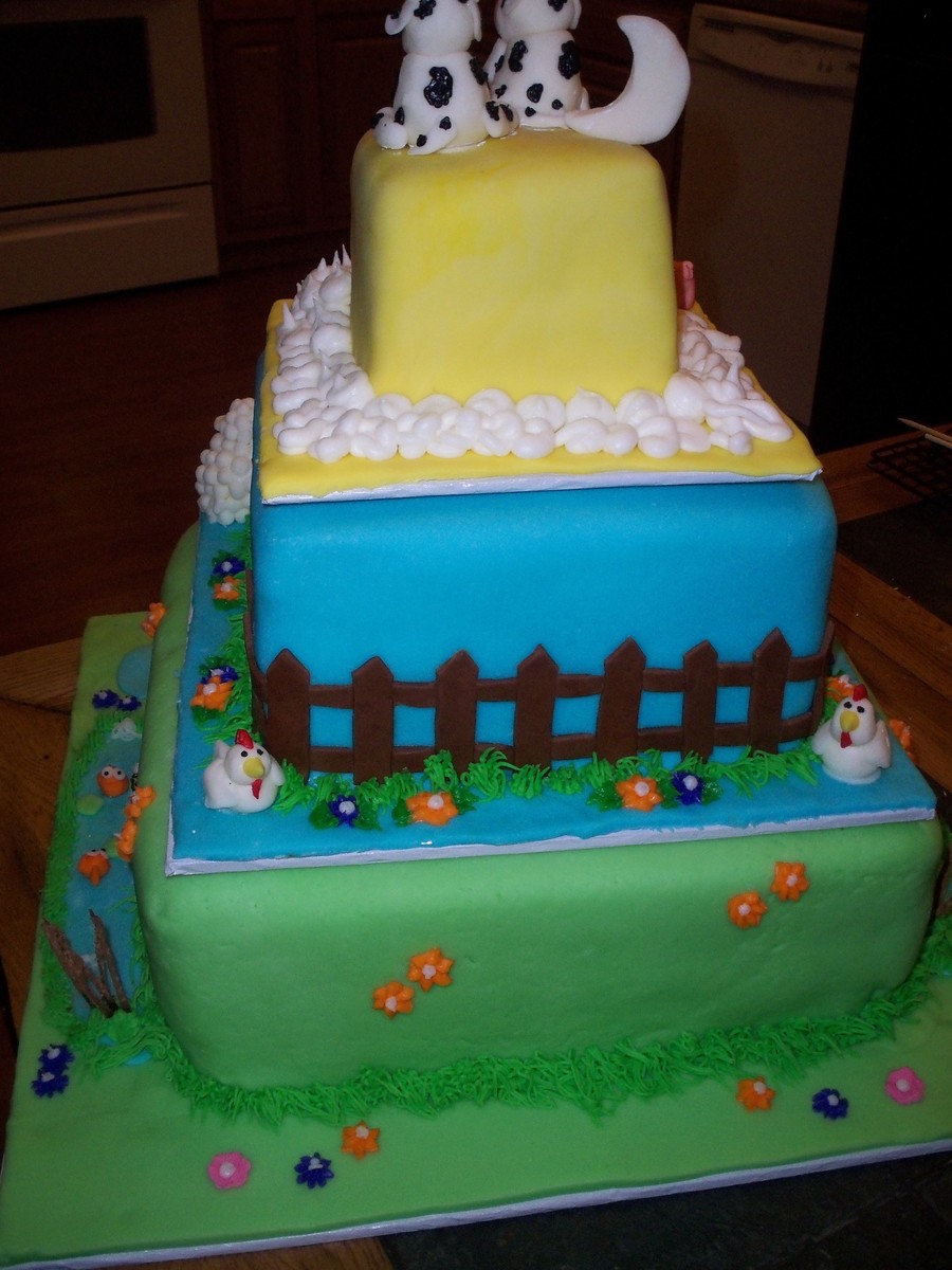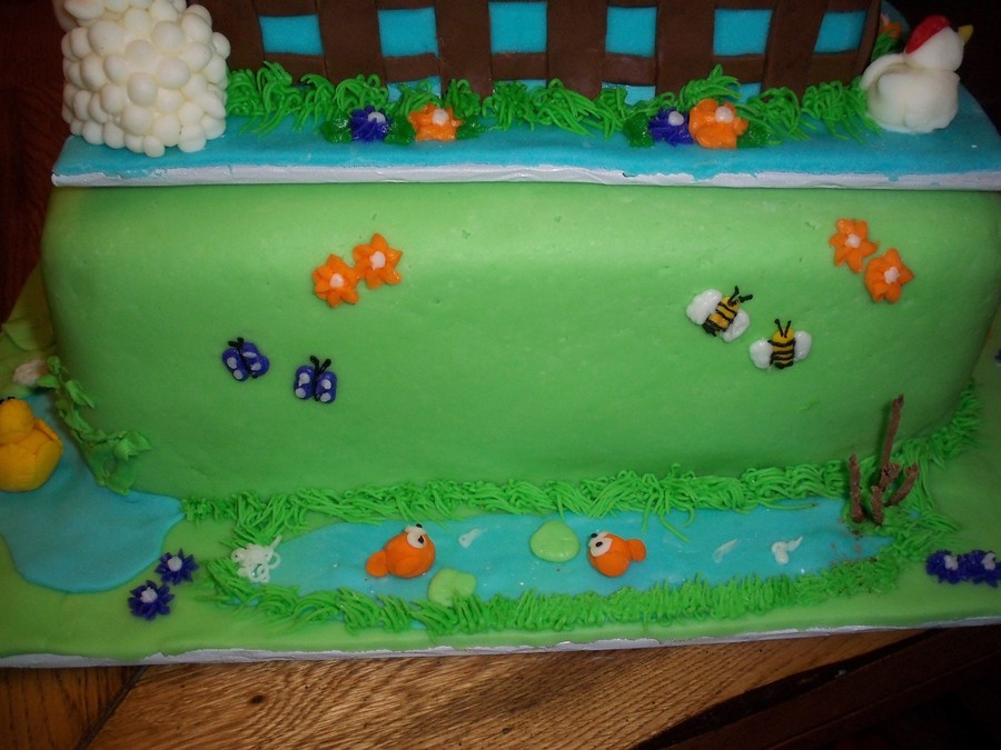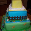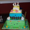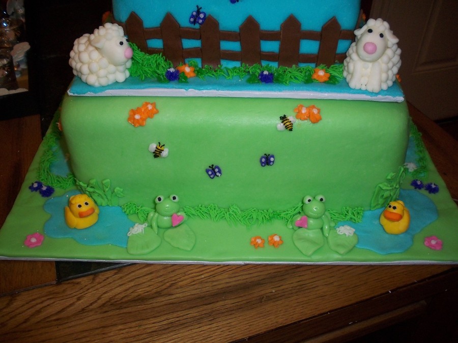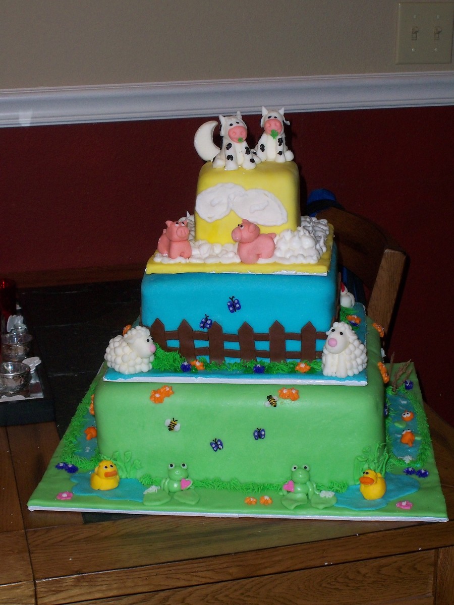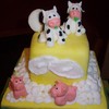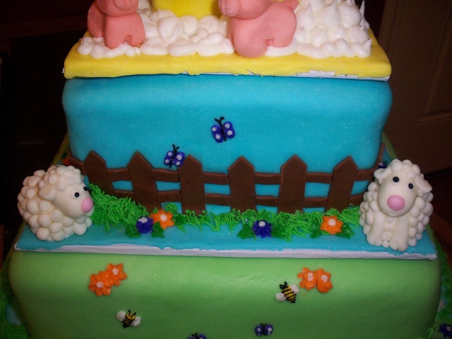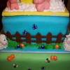 This cake was inspired by one here on CC by Liis called "Happy Little Farm". It was so cute. This was done for a baby shower for twins. Everything is in sets of two on here, including the flowers, bugs and animals. It took a long time to make, but I was very proud of it when done. The cake had to travel about 50 miles and needed to be set up by the customer, so I had to make three separate cakes (thus the oversized boards in between). That way the customer could just stack them and go.
