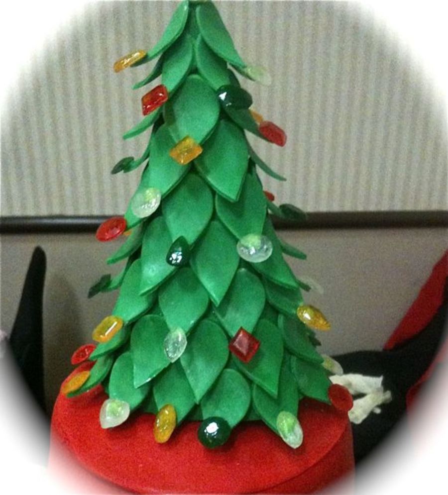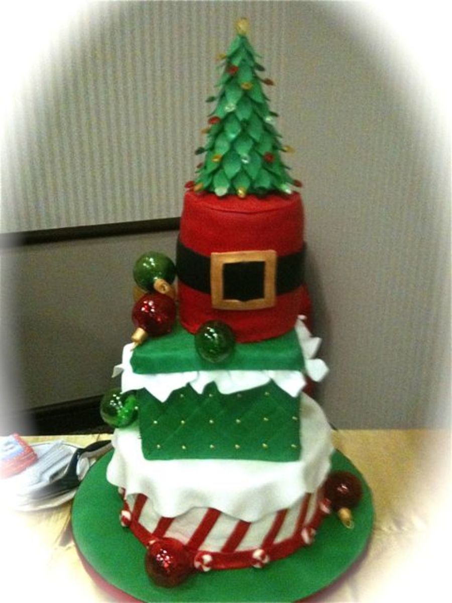 12" round buttercream iced w fondant stripes & topped with fondant "snow", 8" square fondant covered Christmas present box w fondant "tissue hanging out", 6" round fondant Santa's belt tier, + hand made fondant Christmas-tree-cake topper with my hand poured sugar jewel ornaments; Christmas Ball Ornaments are hand my blown sugar "glass";Â the little "peppermints" are hand formed fondant; serves 172 (I will submit addt'l photos of close ups.)