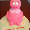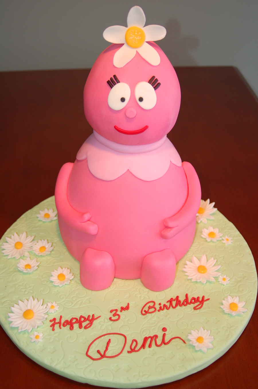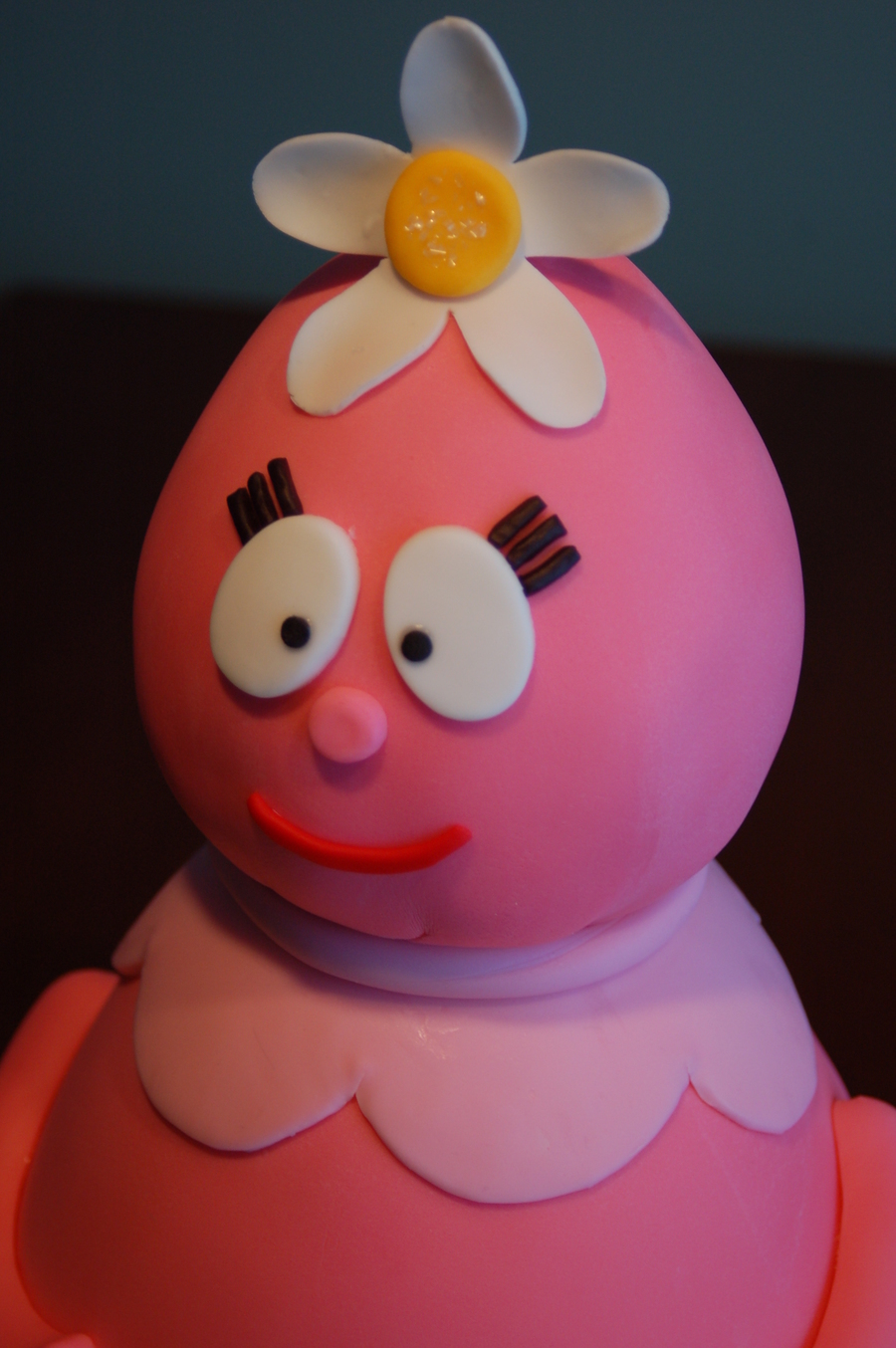 Foofa cake from the tv series Yo Gabba Gabba. 5 layers of Yellow cake with butter cream filling and icing, rice treats for head and covered in fondant.