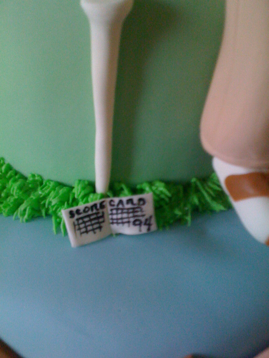94 year old fondant golfer on an argyle chocolate cake bottom with a RKT golf cart covered in fondant.