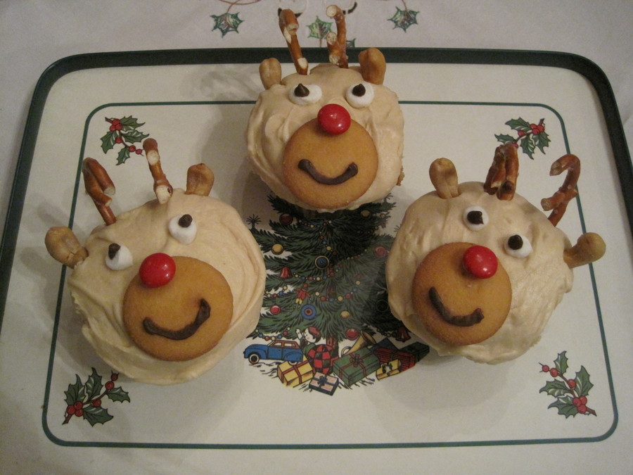 Reindeer cupcakes - caramel icing - used vanilla wafers but ginger snaps will work. Cut miniature marshmallows in two and dotted with icing. Used M&Ms and broken pretzels. Used cashews for the ears. Fun!