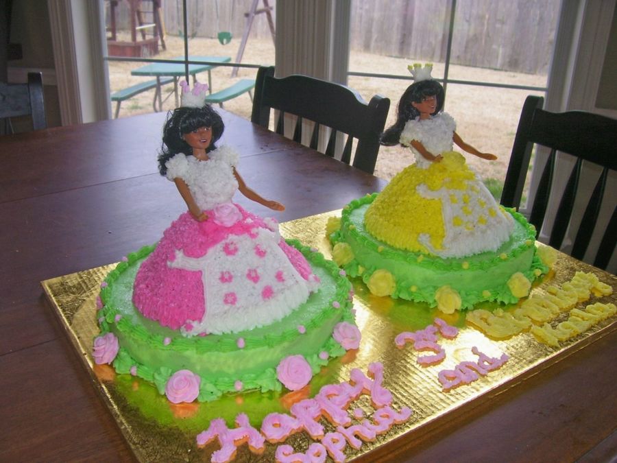 These were for twin girls turning 3. Very self-explanatory. The bases are 10'rounds. The dresses are "wonder mold", and all was done in butter cream and royal icing.