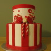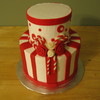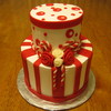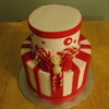 this is a very small practice cake,i wanted to try my hand at stacking and ribbon roses and also a new frosting i found called whip'n ice just like whipped cream but doesn't need to be refrigerated after it is whipped.hubby said the top looked a little plain so i added the dots.top is chocolate cake with strawberry cream the bottom is chocolate cake with caramel sauce and toffee cream.