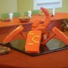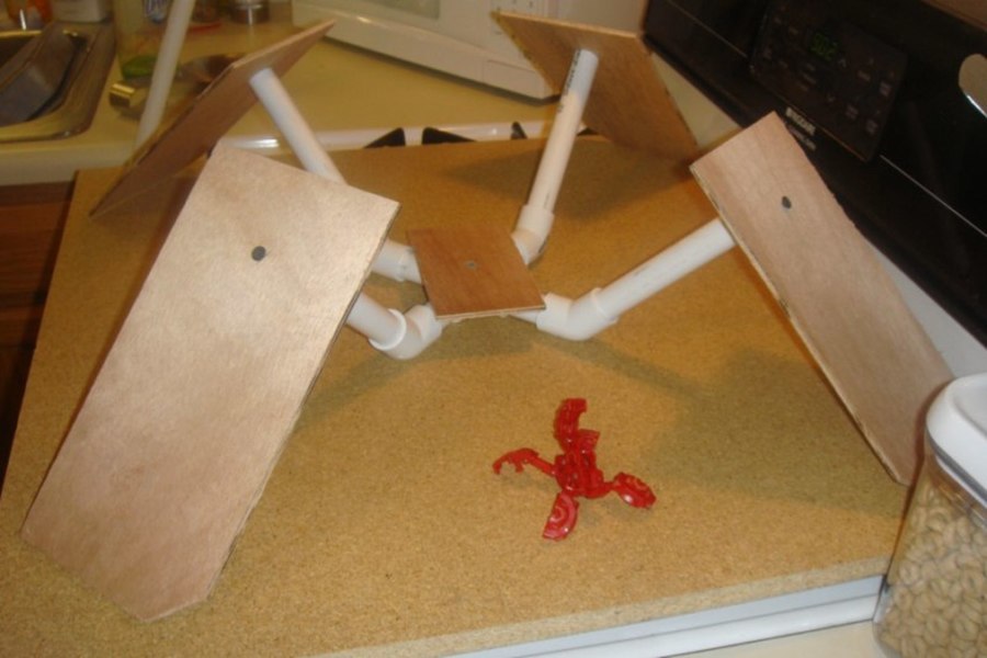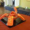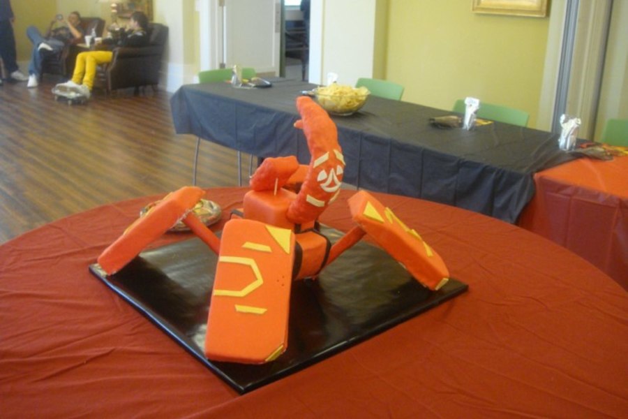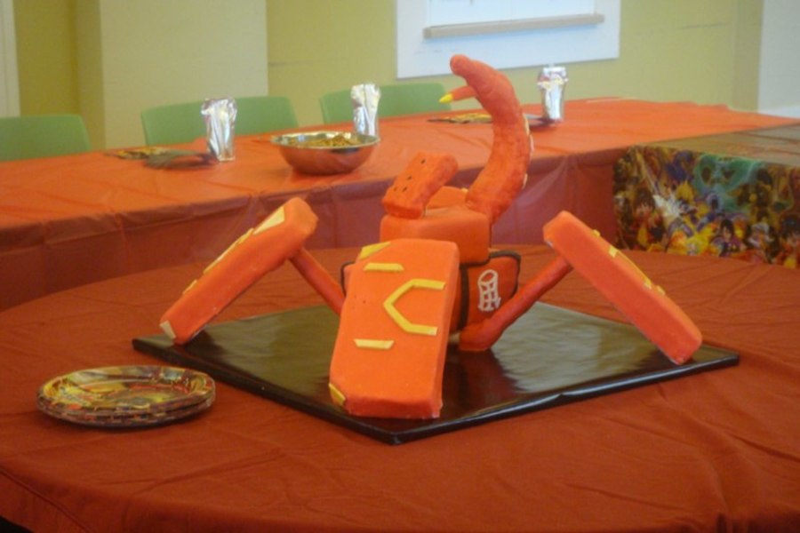 This is and open Bakugan Cake. It was built with a structure made out of wood, pvc pipe and metal. All four "feet", the body, tail and head are edible. The tail and head is made of rice krispies treats.
