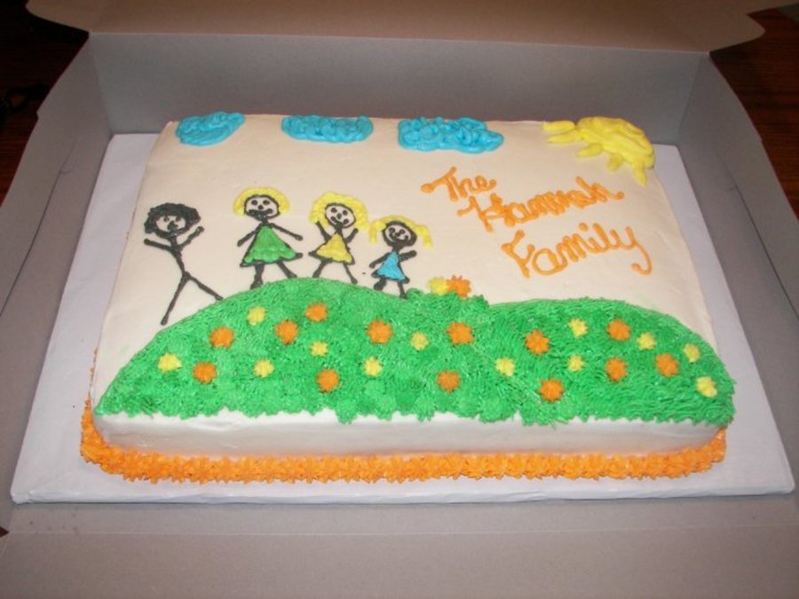 My Best Friend Adopted two beautiful girls this year and we had a celebration once it was finalized. The cake theme is taken from 1st picture her youngest drew when she first came to live with them when she was 4 she is now 8.