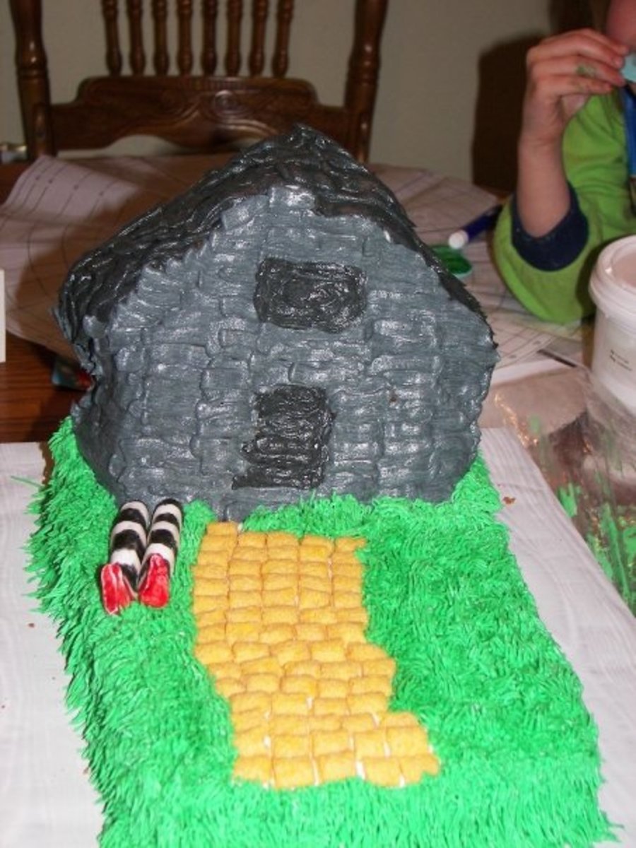 1/4 Sheet Cake with 3-D House Pan, Captain Crunch for the yellow brick road and Fondant for the legs