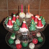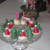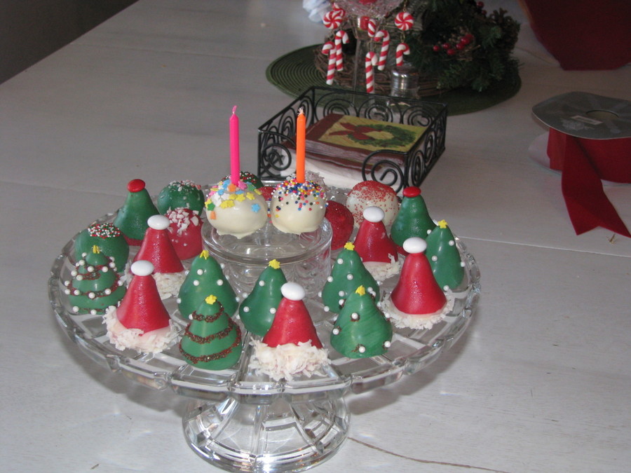 This was for friends whose birthday is a few days before Christmas. That is why I added the two cake balls with the candles. Christmas cake ball ideas from Bakerella.com. I used coconut for the santa hats.