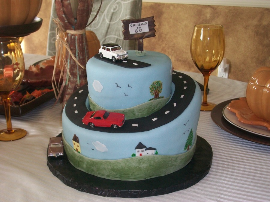 This cake was made for an 80th birthday. The cards matched the saying at the top "Cruising to 80". Had painted accents on the sides of the cake.