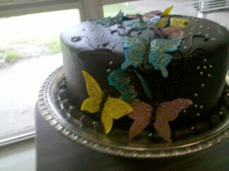Chocolate cake with peanut butter mocha icing. Fondant butterflies accented with gold dust.