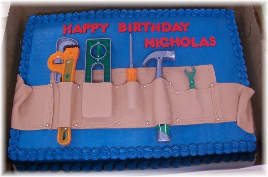 Butter cream with fondant tool belt and lettering. Toy tools used.