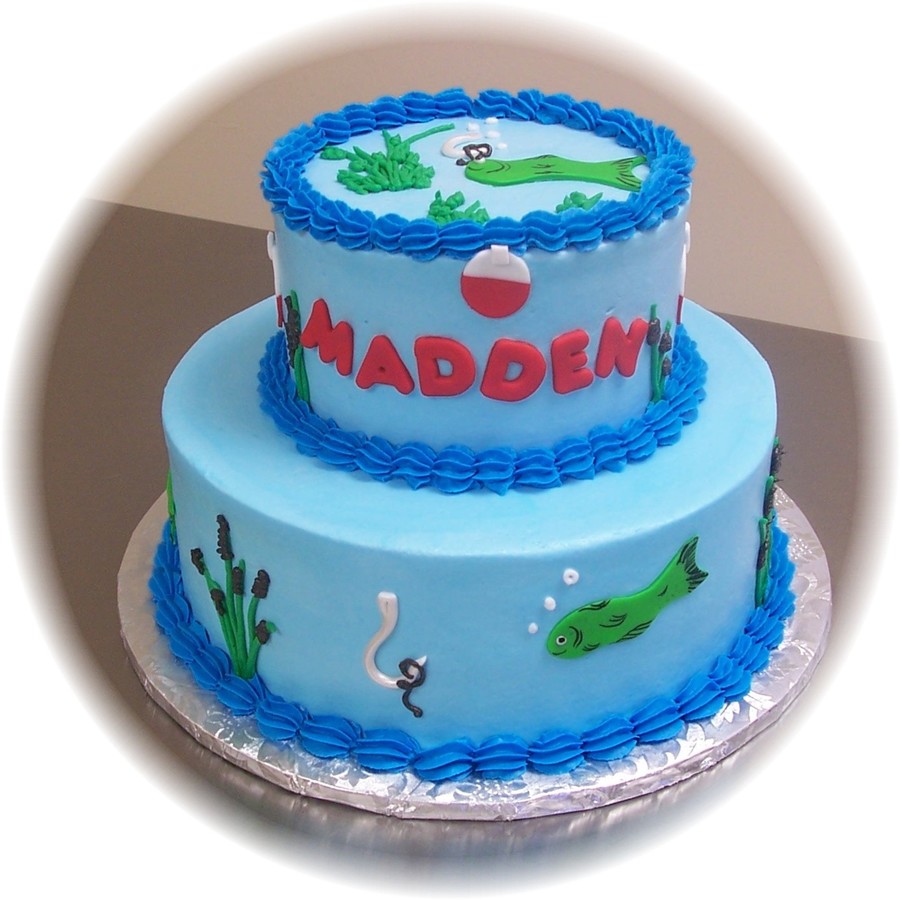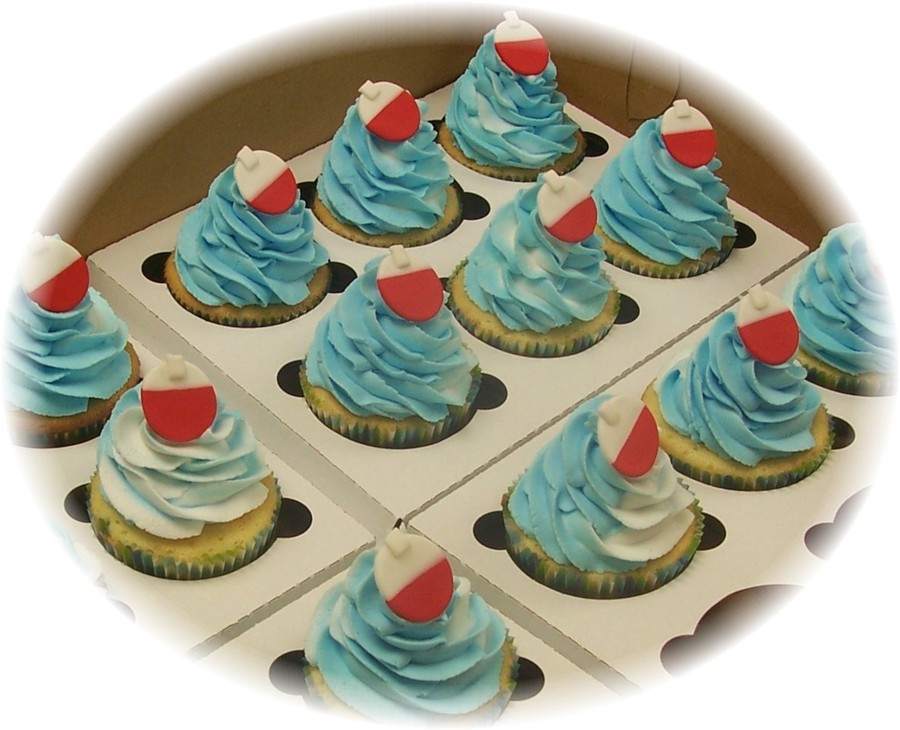 Butter cream with fondant deco. Additional picture of cup cakes with bobbers to match cake.