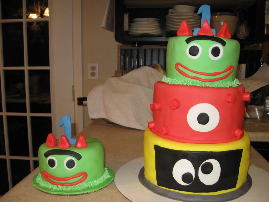baby's first birthday, top two cakes are white cake with strawberr buttercream, bottom cake is chocolate cake with chocolate peanut butter buttercream. Baby's cake is white cake with vanilla buttercream. Coverings are homemade mmf, everything is edible. I had no idea who o gabba gabba was when I had the request, since all of my kids were teens!