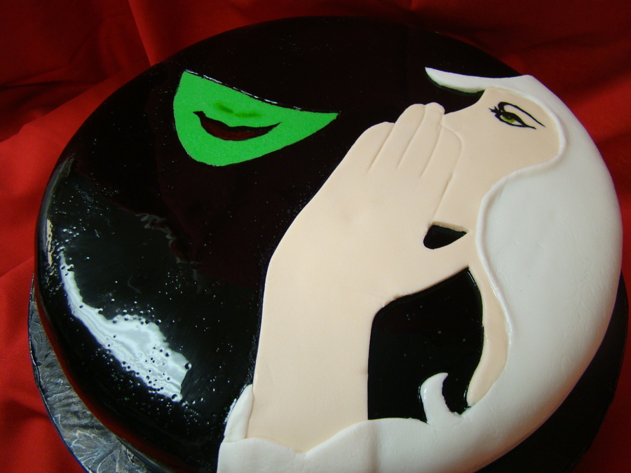 Wicked poster image wrapped around 10" cake. fondant over fondant and hand painted