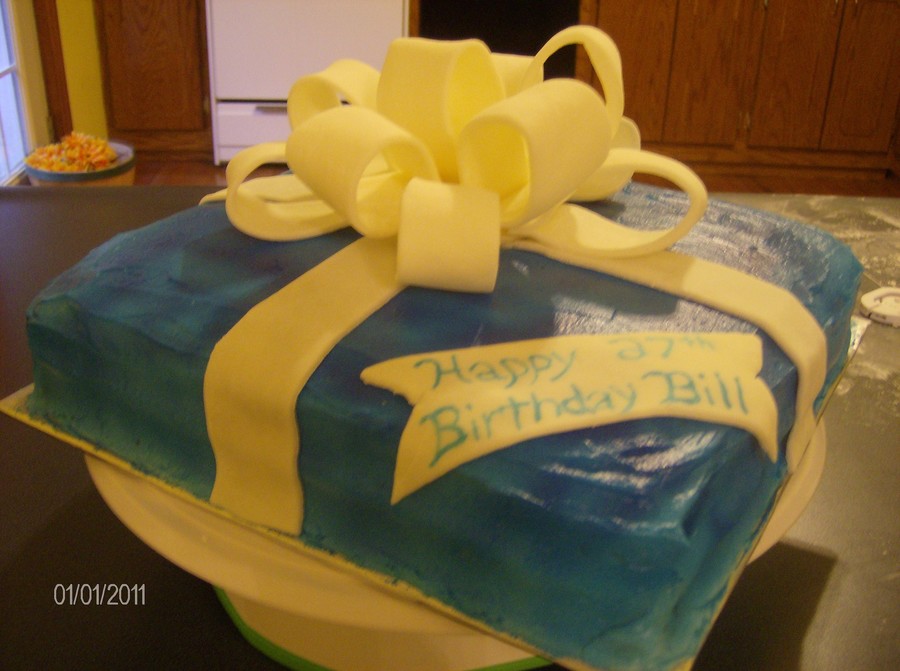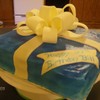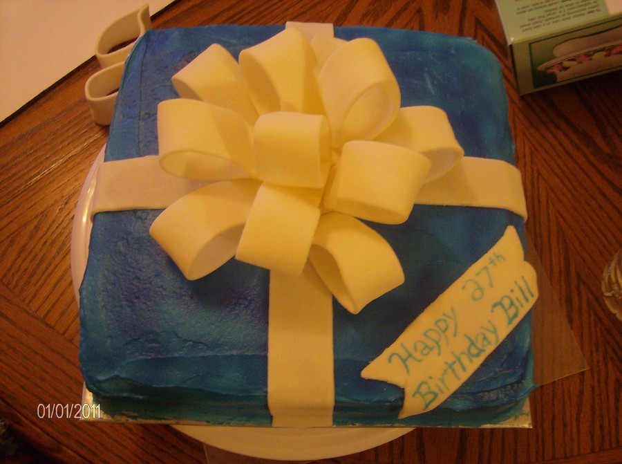 This is a white cake with reese's cup filling. Buttercream icing. I airbrushed it blue...first time airbrushing a cake and my first fondant bow. Made it for my brother.