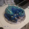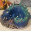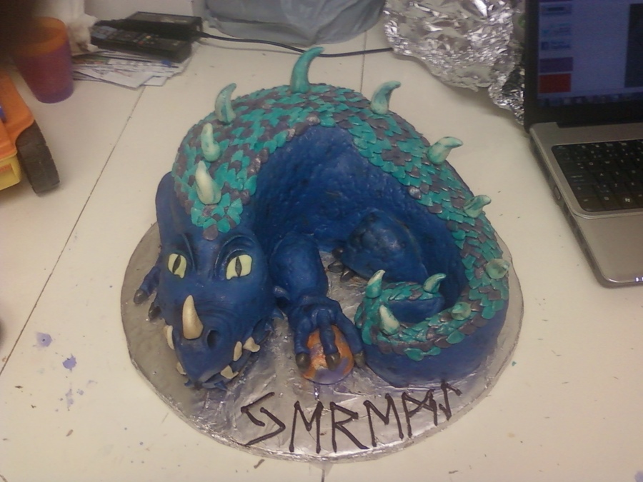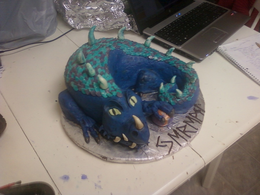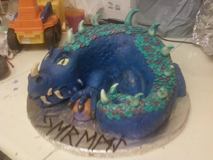 fist 3d cake ever, i have done 1 in buttercream but it was very basic, this was carved from a 12" round .choc cake filled with whipped white and milk chocolate ganache, cumb coated in ganache and covered with modelling chocolate. added wings and horns at the party and am waiting for rest of the pictures. Definitly learned alot :)