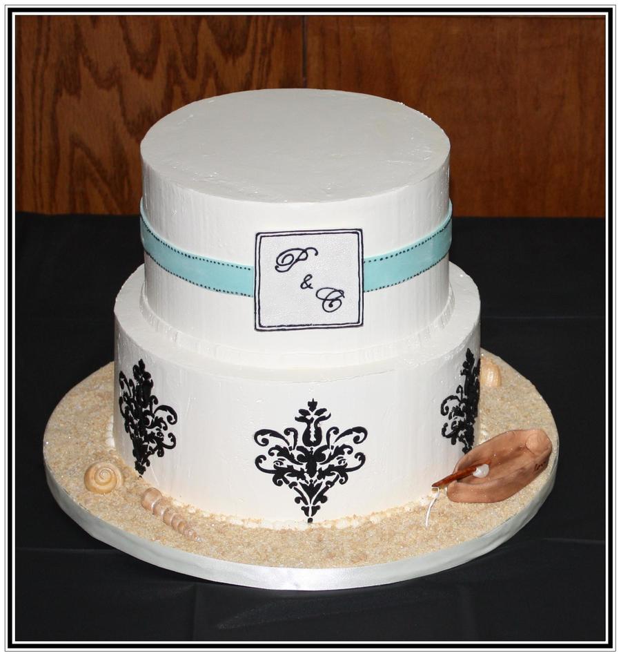 Engagement cake. They love to fish so they wanted something 'beachy' but also based on the napkin they provided. IMBC, black BC stencil, fondant band around the top tier and gumpaste plaque. The sand was made from brown sugar, graham crackers, and sanding sugar to give it dimension (although you couldn't really see it in the photo). Chocolate shells, gumpaste boat with gumpaste fishing pole. TFL!
