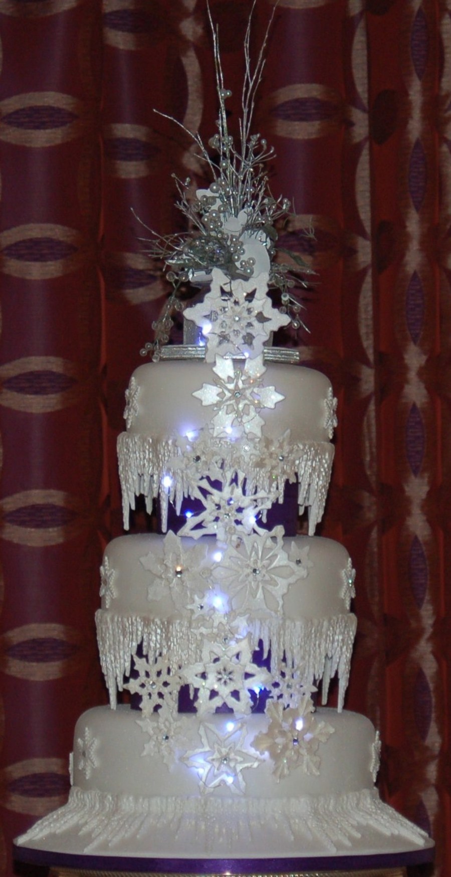 A three tiered wedding cake adorned with snowflakes, icicles, and swarsvoki crystals and airbrushed with a satin finish.