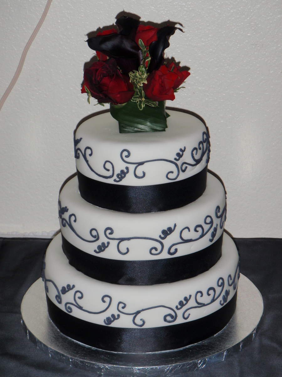 This is a simple yet elegant wedding cake I was asked to do. All tiers are covered in fondant, with royal icing scroll work, satin ribbon and fresh flowers. Thanks for looking!