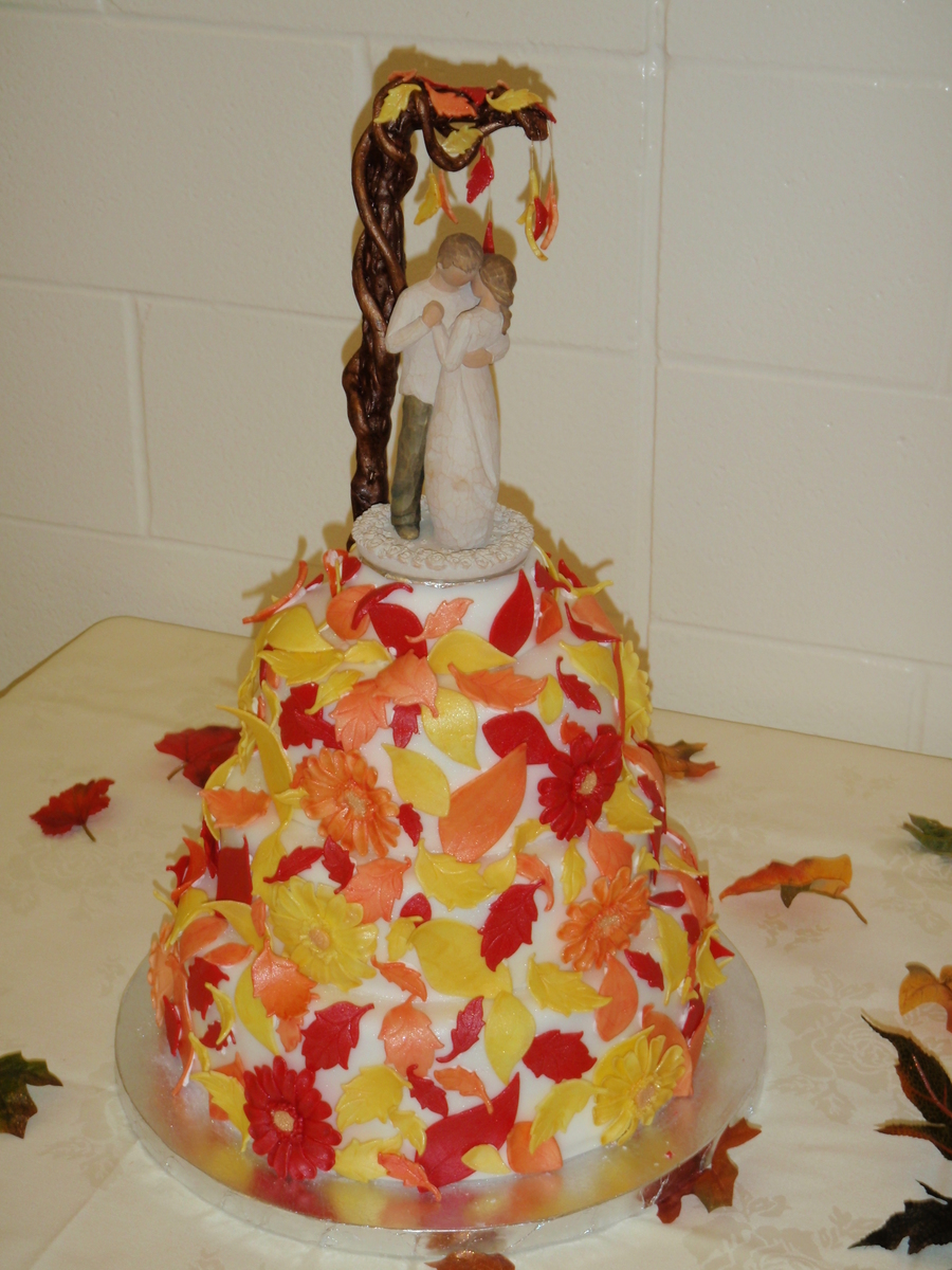 This colourful fall wedding cake is covered in fondant, gum paste leaves and daisy's all covered in luster dust. Thanks for looking!