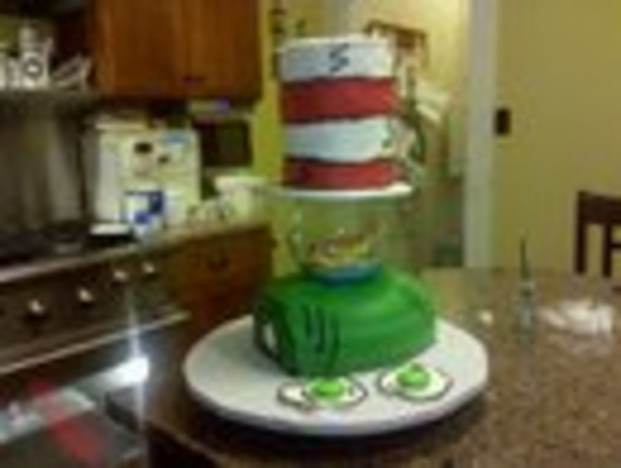 Thank you Malene541 for all your help on this cake. Bottom ( ham) was choc with buttercream icing, Fish was fondant and the hat was four 6inc rounds individually iced. The Green eggs were fondant too. I did this for a good friends little boys first birthday. It was really fun.