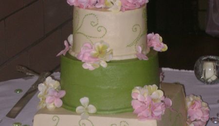 Cross cake with BC, stenciled with luster dust, detailedwith fondant flowers and BC scrolls