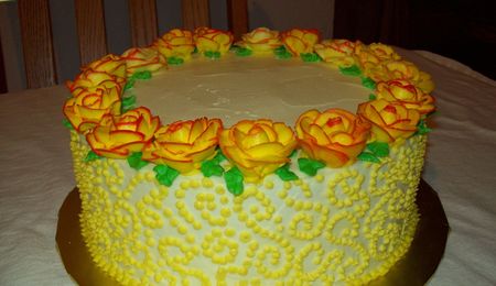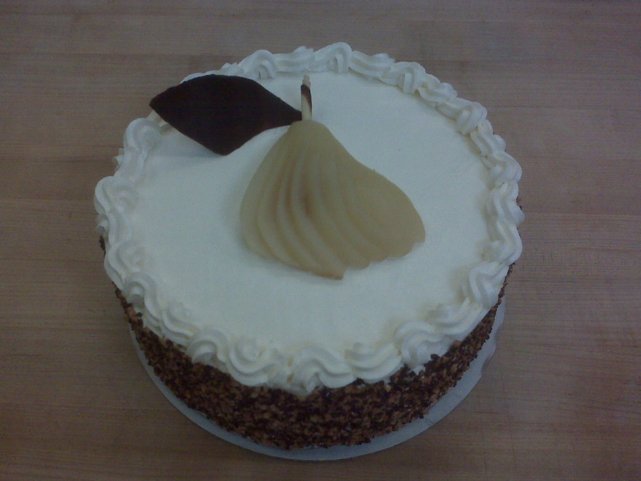 Vanilla sponge cake with Italian butter cream, mousseline cream filling with poached pear. The sides are covered with praline and chocolate sprinkles and topped with a poached pear and chocolate leaf. The sponge cake was also brushed with a pear liqueur syrup.