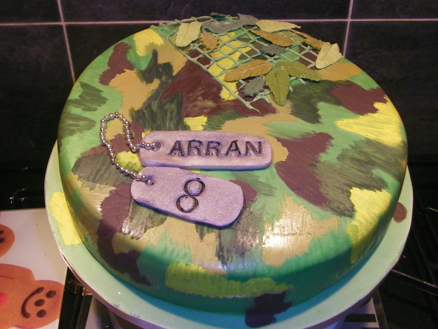 I was asked for a cake with an army theme for an 8 year old boy . Chocolate sponge layered with buttercream and covered with fondant . I hand painted the fondant with food colourings .; the dog tags and leaves on the netting are made from fondant too .