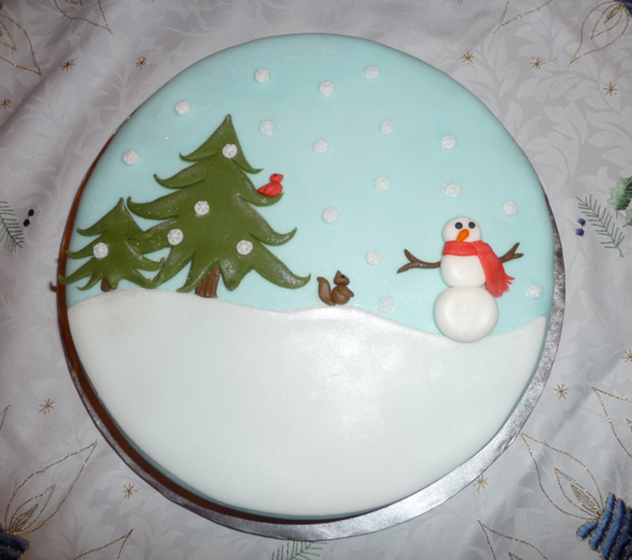 This was one of those last-minute, 2 a.m. cakes, decorated strictly to please my youngest nephew. The snowflakes were made by pressing a tip 2D (dusted in cornstarch) into the fondant and then cutting that out with a number 12 tip. I didn't have any cookie cutters with me so I had to cut the trees out by hand. The squirrel in the center was a joke-- the squirrels in my home town are apparently taking over, and my mother and brother detest them. Everything was dusted liberally with pearl dust, including me.