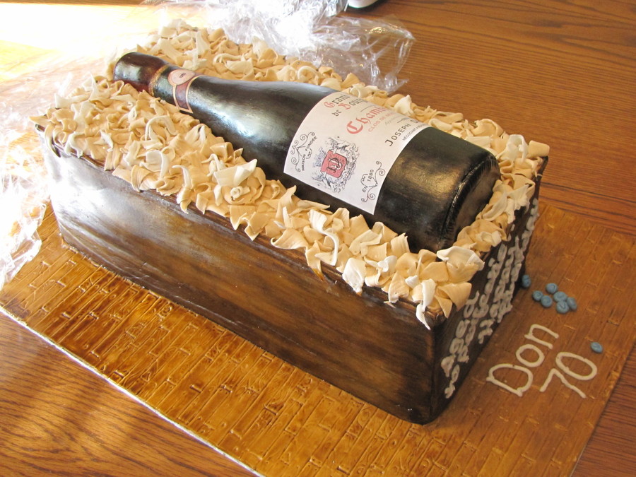 Chocolate wine bottle mold covered in fondant. Paper labels and fondant covered box with fondant wood shavings.
