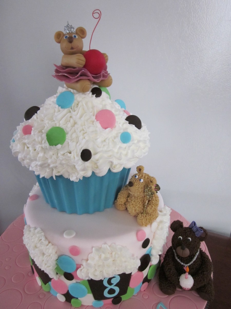 Cupcake cake!!! Was so much fun to do! Client wanted a cupcake cake with build a bear theme tied into it. Actually made a bunch of clothes but once on the cake it looked too crowded. My first time doing a giant cupcake, candy melts gave me a hard time with bubbles. First time making bears, they were fun to do!