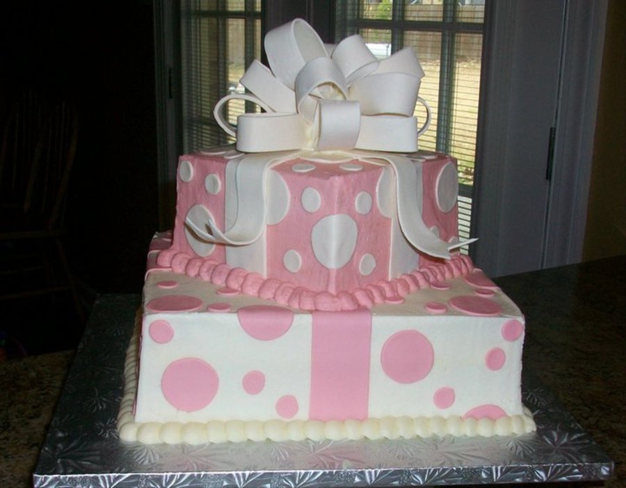 Baby Shower cake made to look like presents. White Cake with White Chocolate Cheesecake filling. Buttercream with fondant accents and gumpaste bow. This was my first time making a bow like this and I am still working on getting my squares corners crisp. TFL!