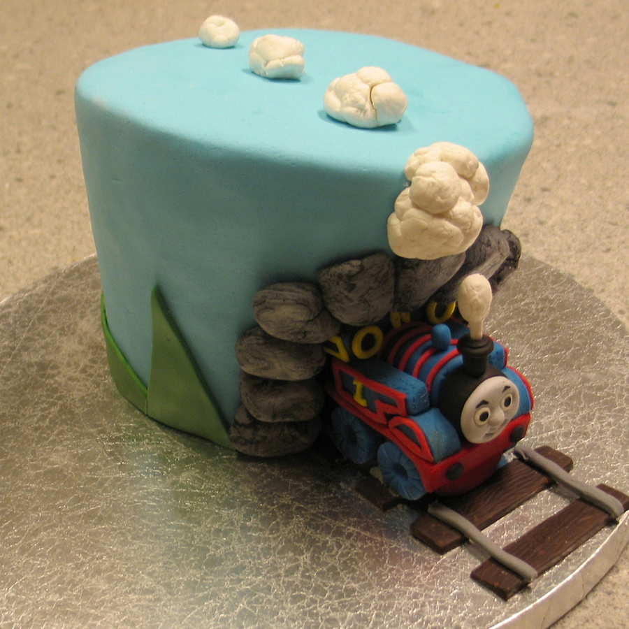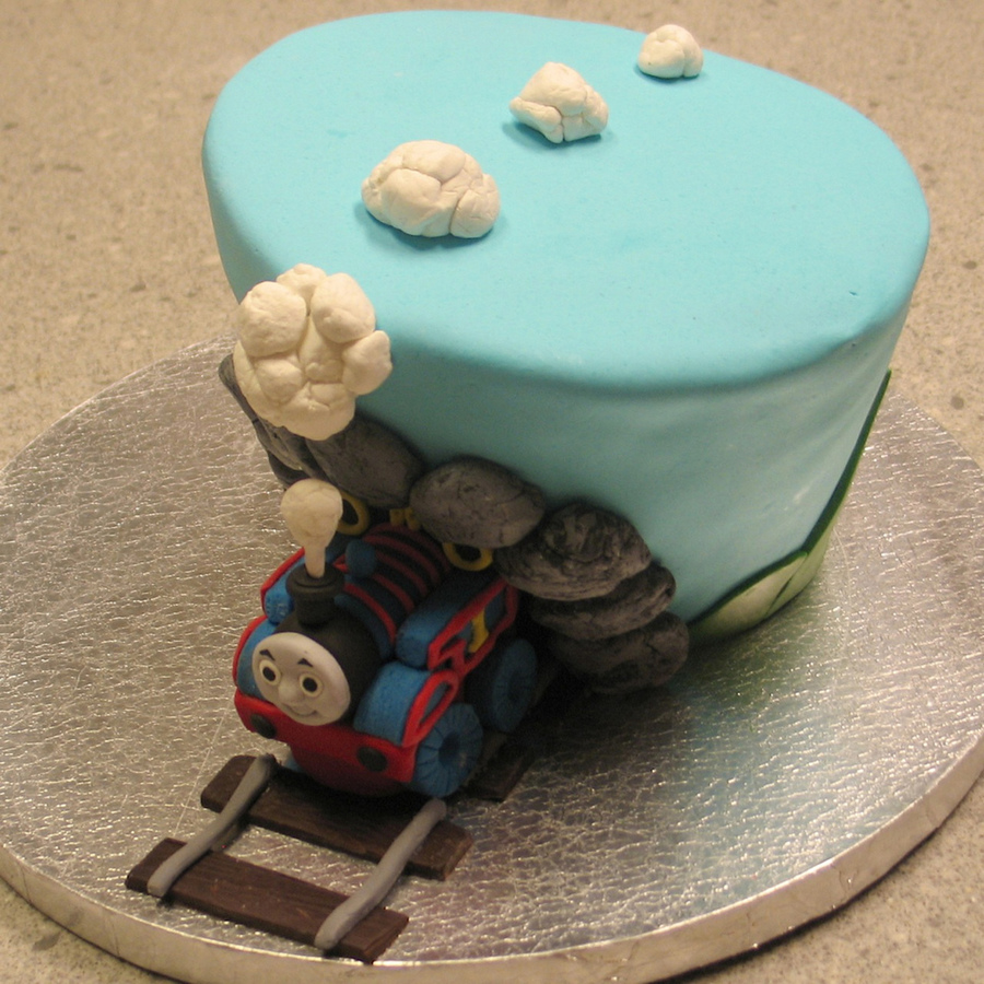 Vanilla cake with strawberry filling and chocolate butterream. Gumpaste Thomas, all other decorations fondant and/or gumpaste, except the railroad ties - those are modeling chocolate.