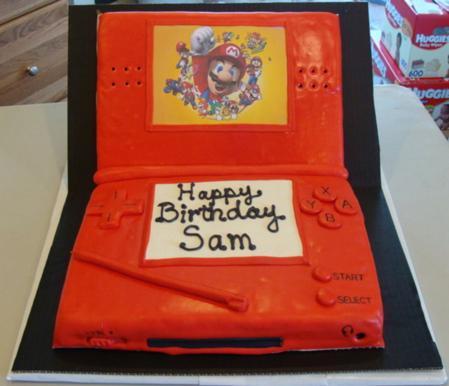 Birthday cake for my 10 year old son, fondant covered, with cheater mario screen from a printed picture of the internet, glued on with frosting :)