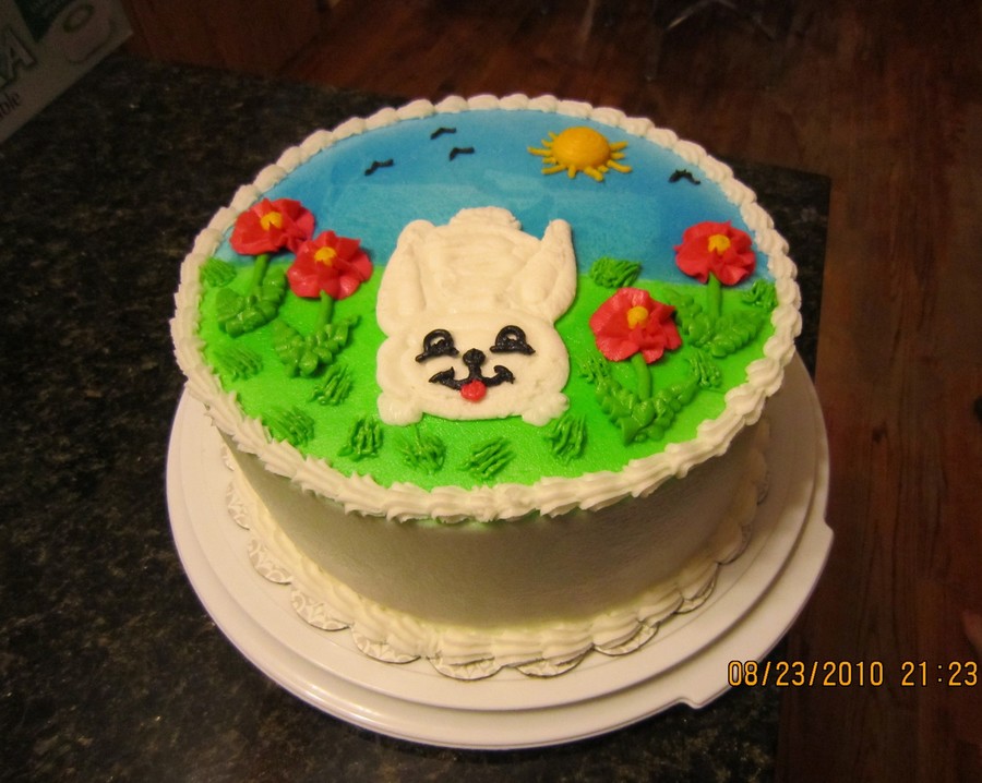 I finally decided to take the Wilton classes and it seems a bit too late. Apparently they changed the class structure a few months prior and don't teach a lot of the same things anymore. After taking the classes I think I would have learned a lot more if I had taken the older classes. Anyway, this is my final cake for course 1. It is a 9" four layer white cake with a bunny buttercream transfer.