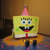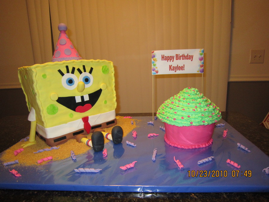 I made this for my daughter's birthday. Spongebob is made of three 12x12 cakes, cut in half and stacked. The hat, party curls, nose, arms and legs were made out of gumpaste and the rest of the details are fondant. His cake is made from the Wilton cupcake pan and I just printed the sign off the computer. This took a long time to make, but was a lot of fun!