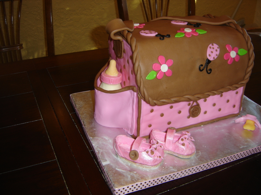This cake was modeled after the Mom to Be's crib set and colors (Brown and pink). All fondant and gumpaste work. Baby bottle made out of a chocolate mold.