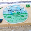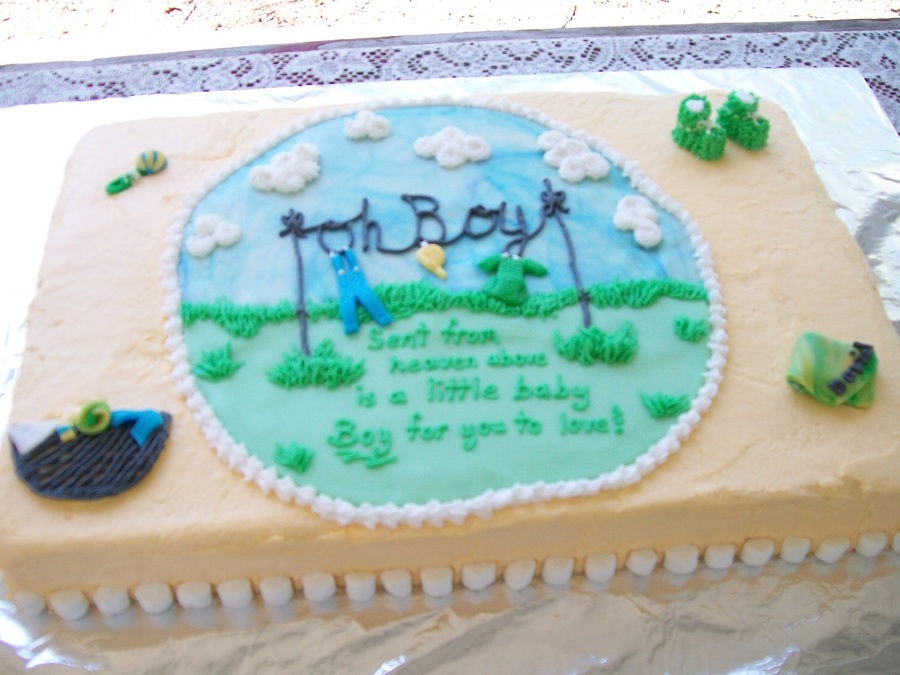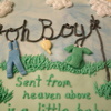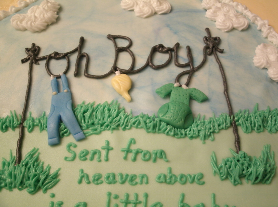 This was a cake I made for friends of ours, on the arrival of their little boy. The background and clothing is made with marshmallow fondant (some of it I marbled) and the rest is buttercream icing.