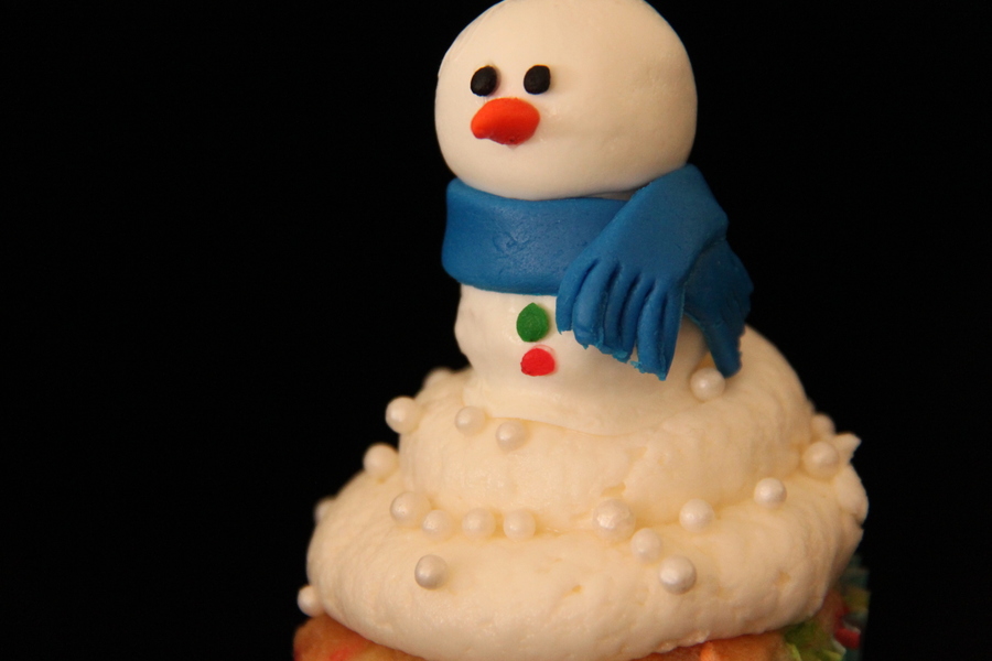 rice krispy snowmen dipped in candy melts with fondant details on a pile of buttercream. white cupcakes with sprinkles.