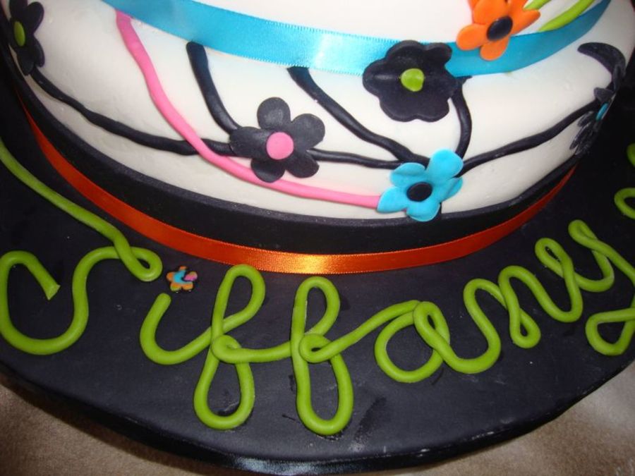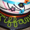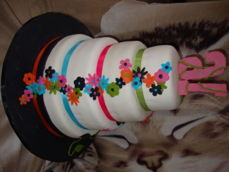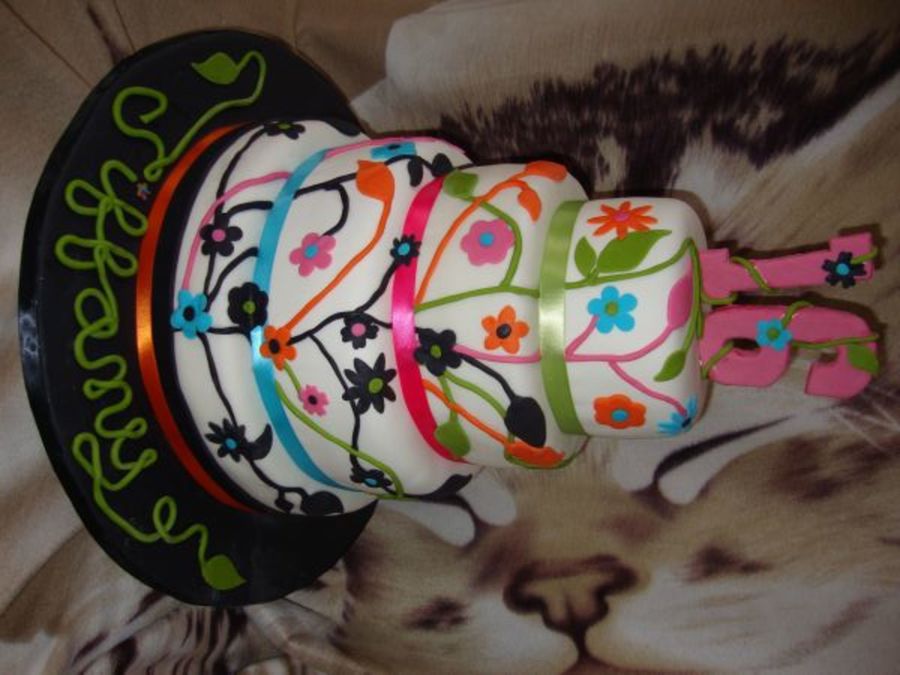4 tier yellow and chocolate cake with buttercream filling and fondant. Numbers are made of gumpaste. This is a sweet 16 cake. My second tiered cake. I love the back "seam".
