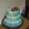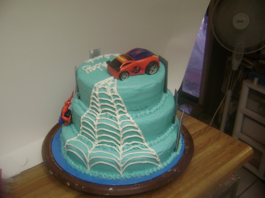 3 tier with spiderman climbing his webs up the side in between fondant buildings to get to his car perched on top