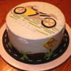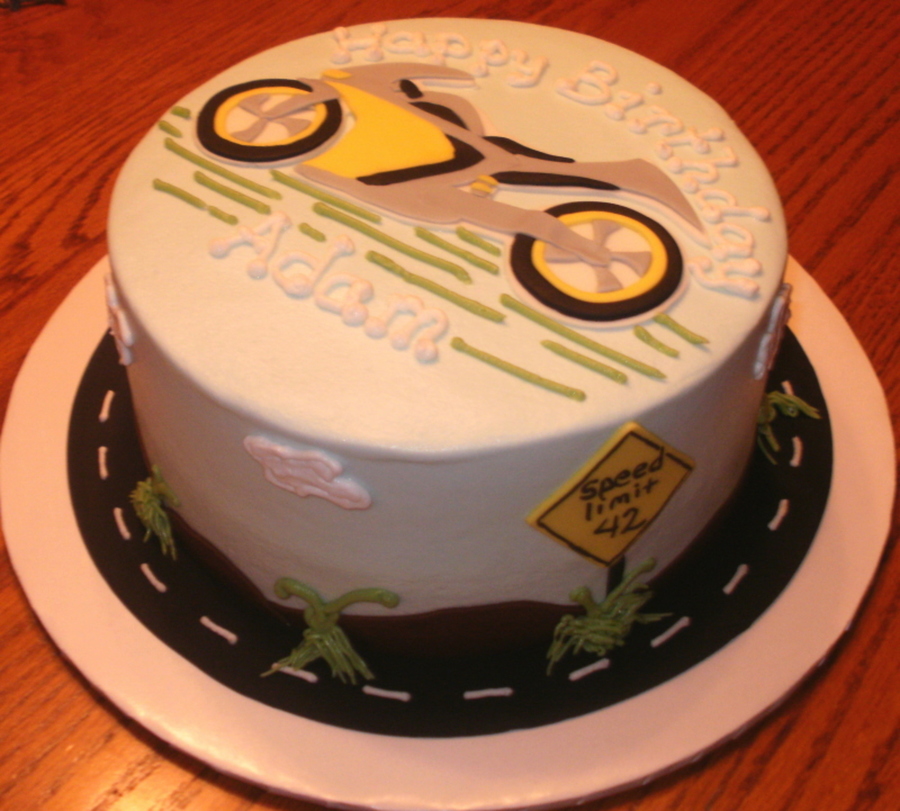 8 inch chocolate cake with buttercream icing. The motorcycle, road and signs were made from fondant.