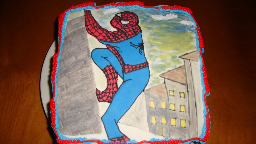 Spiderman climbing building MMF covered cake with fondant Spiderman image. Triple layered chocolate cake with vanilla buttercream filling