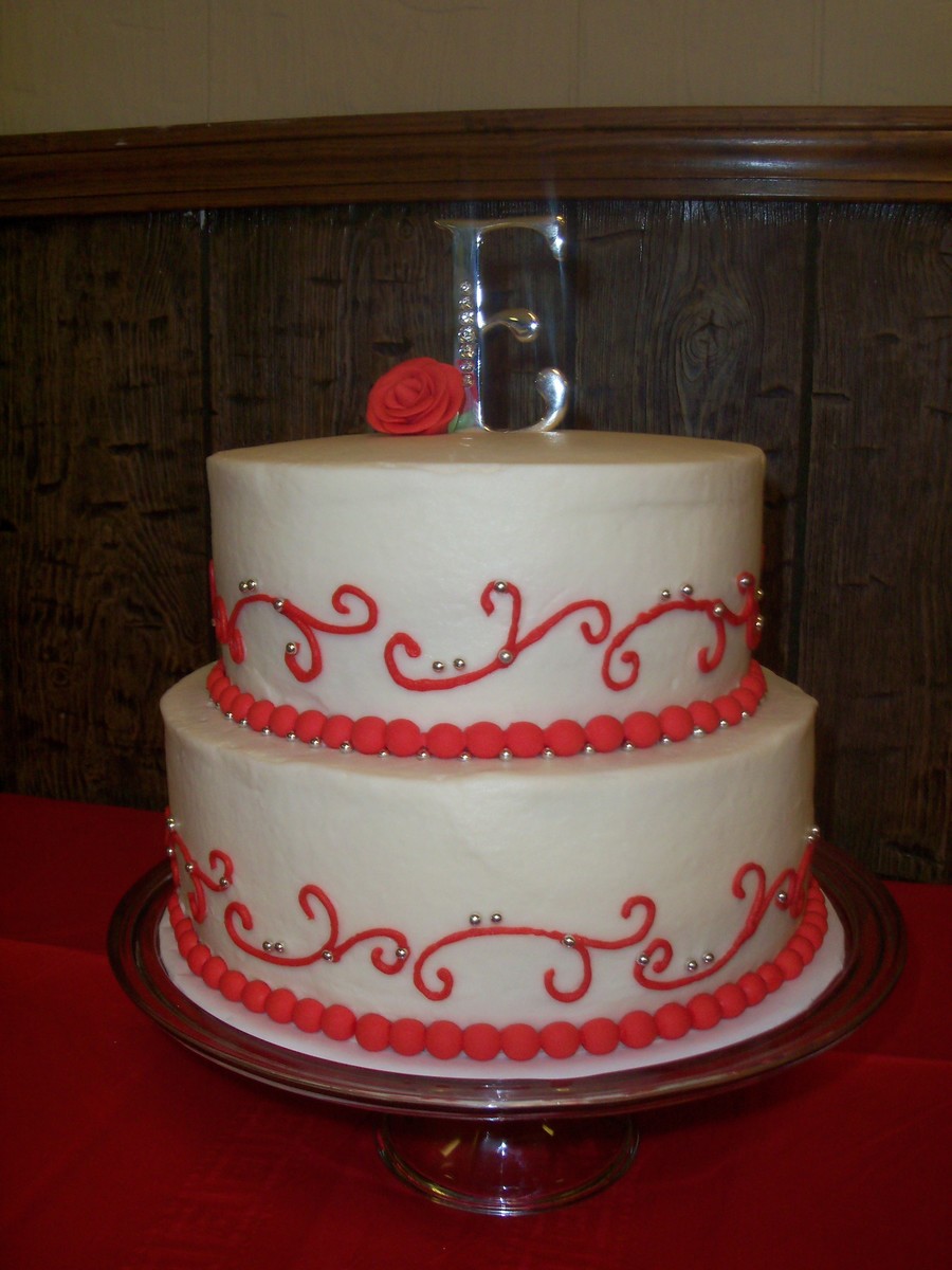 Simple round tiered wedding cake. It was accompanied by 300 cupcakes! Cake is red velvet w/ vanilla buttercream filling.