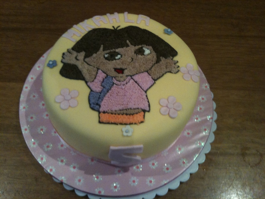 Chocolate Cake covered in buttercream and fondant. Doras face made with buttercream.